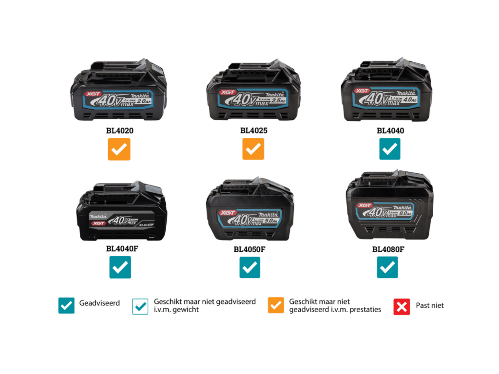 De machine werkt standaard op één XGT 40V accu. Plaats je twee accu’s, dan haal je met 2x BL4080F een werktijd van tot wel 200 minuten op vol vermogen. Voor nóg langere inzet is er een optionele PDC1500 rugaccu beschikbaar, waarmee de werktijd kan oplopen tot 500 minuten.