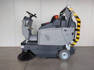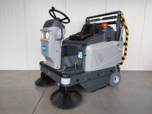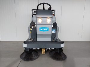 De Meijer VR1300HD is een sterke opzit veegmachine met een hydraulisch hooglossysteem. Hiermee kan je de vuilbak van 115 liter automatisch legen op een hoogte van 40 tot 145 cm. De werkbreedte van 80 cm kan met behulp van de twee zijborstels worden uitgebreid tot 130 cm, waarmee hij tot 9.700 m² per uur kan vegen.